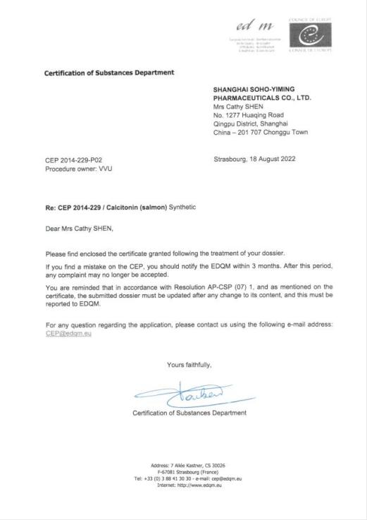 2022 年 8 月,上海蘇豪逸明公司順利完成鮭降鈣素原料藥五年再注冊申請工作,并收到歐洲藥品質量管理局(EDQM)頒發的 CEP 證書(No.R1-CEP 2014-229-Rev00)。