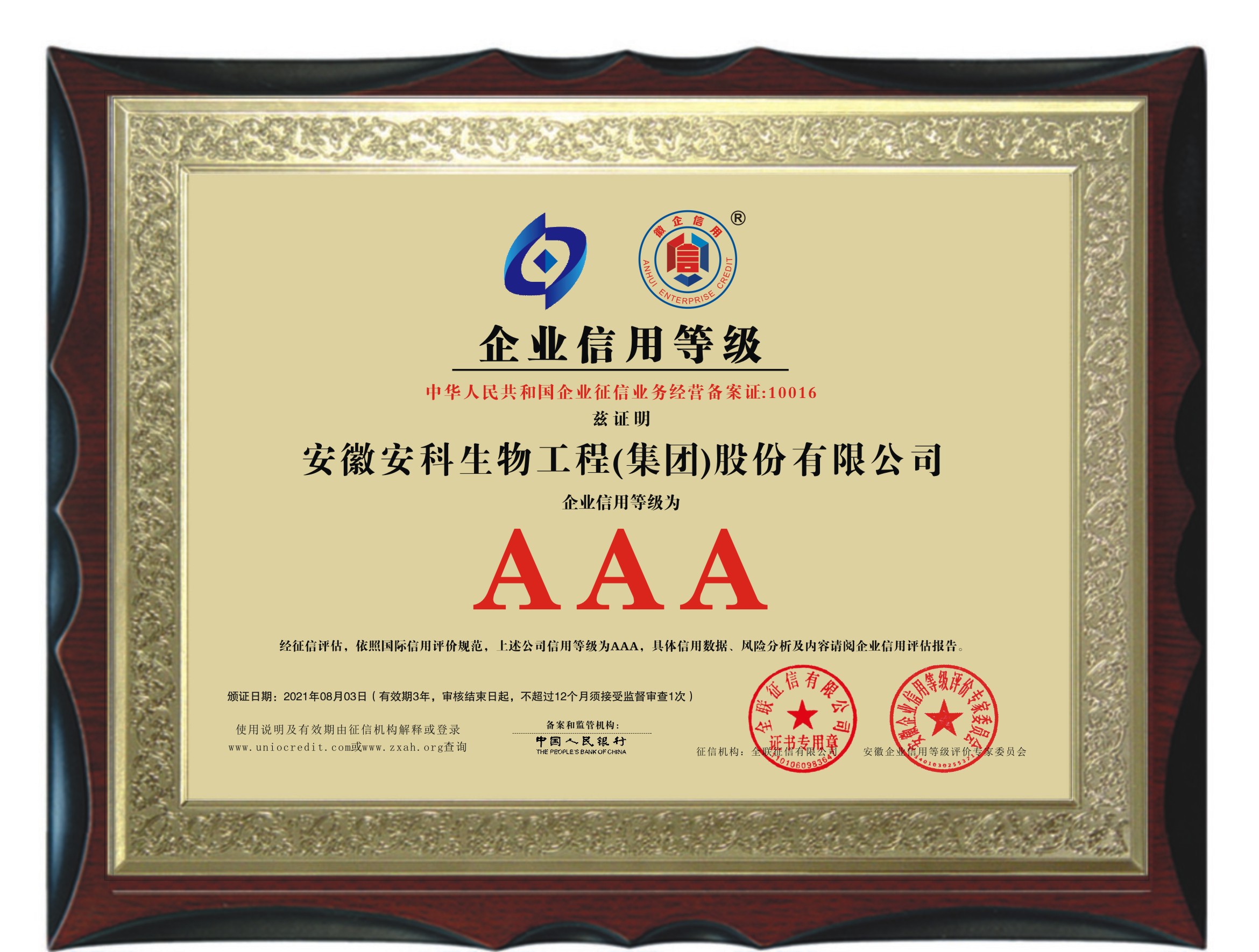 本次評選活動,由安徽企業(yè)信用等級評價專家委員會、安徽省創(chuàng)業(yè)創(chuàng)新企業(yè)家論壇組委會、安徽省企業(yè)經(jīng)營與管理研究會、安徽省創(chuàng)新創(chuàng)業(yè)企業(yè)服務中心聯(lián)合組織開展。安徽省創(chuàng)業(yè)創(chuàng)新企業(yè)信用評價工作 2019 年、2020 年已連續(xù)開展兩年,為加快推進了我省社會信用體系建設,不斷提高安徽省創(chuàng)業(yè)創(chuàng)新中小企業(yè)誠信建設水平,推動企業(yè)誠信自律,提升企業(yè)信用風險防范能力,促進企業(yè)可持續(xù)發(fā)展。安徽 AAA 級信用企業(yè)作為安徽省企業(yè)信用評價中最高的信用等級,安科生物成功獲此殊榮,是公司整體綜合實力與競爭力的體現(xiàn),同時也表示企業(yè)經(jīng)營穩(wěn)健,風險防范能力強。
