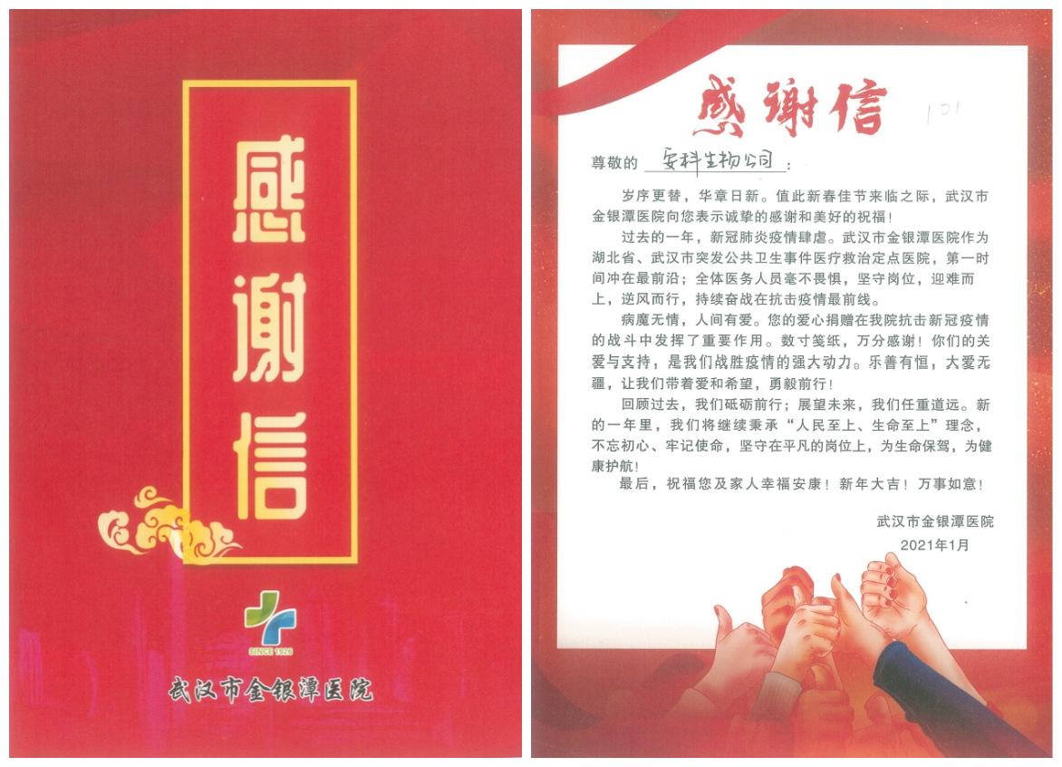 武漢市金銀潭醫院致信感謝安科生物
