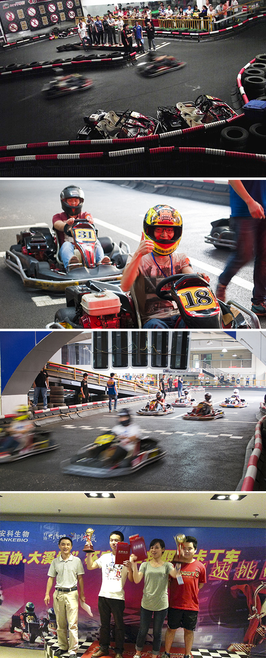 2014年9月26日,由安科生物企劃部策劃發起、合肥百協置地有限公司友情贊助的“百協·大溪地”杯安科生物員工卡丁車極速挑戰賽在合肥D1卡丁車俱樂部完美落幕。短短三小時,在700米長的迷你賽道上,上演了一幕又一幕生死時速。