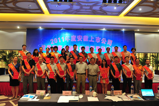 2012727日下午,安徽省2011年度上市公司優(yōu)秀董事會秘書頒獎大會在合肥舉行。我公司董秘李星等20余家省內(nèi)上市公司董秘受到安徽省證監(jiān)局隆重表彰。