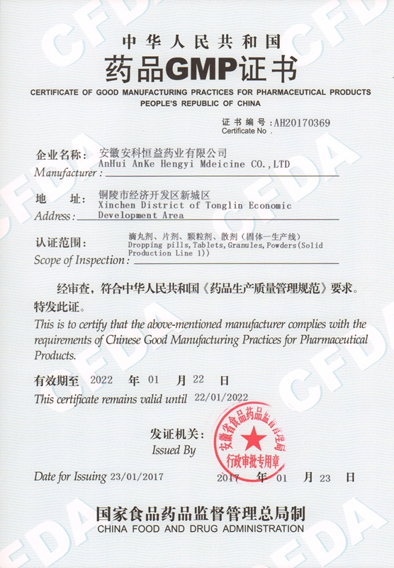 近日,安科恒益正式接到國家食品藥品監(jiān)督管理局頒發(fā)的 GMP 證書。按照國家《藥品生產(chǎn)質(zhì)量管理規(guī)范》(2010 年修訂)及認證管理辦法的規(guī)定,經(jīng)專家現(xiàn)場檢查和審核批準(zhǔn),安科恒益綜合制劑車間固體一生產(chǎn)線(含集團內(nèi)部共用提取車間)符合各項要求,通過 GMP 認證。
