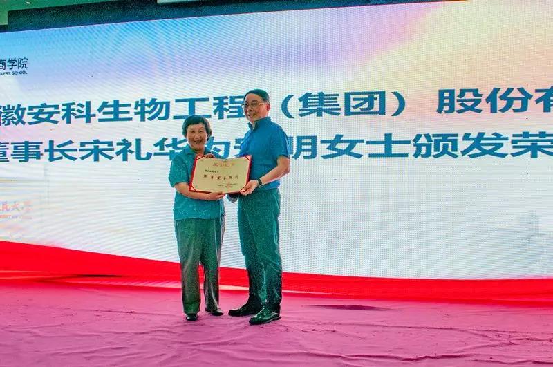 會議當天,還邀請到中國人民大學54級工業經濟系校友、原安徽省副省長宋明女士出席本次會議。宋明女士表示,我一直很關注安科生物的發展。此次合作,將重點從關注人才方面去全力展開,因為高素質的優秀人才是企業發展最寶貴的財富。為了感謝宋明女士對安科生物一直以來的關注和支持,現場由宋董事長為宋明女士親自頒發終身榮譽顧問證書。