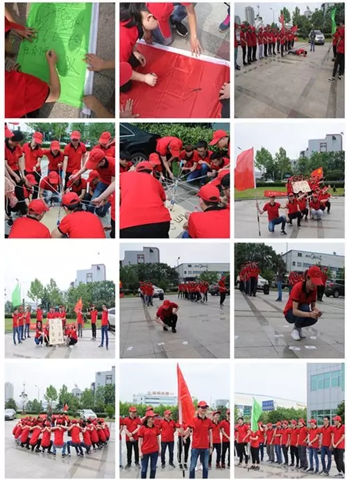 由于天氣原因,拓展活動地點臨時改到公司廣場舉行。拓展訓練開始后,全體團員分為兩個組,按教練的要求,10 分鐘內各隊策劃出自己的隊名、隊訓、隊歌、隊形。通過風采展示,兩隊之間進行PK。經互評和教練打分,佩奇隊優勝閃電隊。