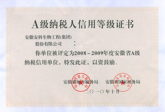 日前,我公司憑借對稅收收入的突出貢獻和誠信納稅的社會責任感,獲得了安徽省國家稅務局和安徽省地方稅務局聯合授予的2008-2009年度“安徽省A級納稅信用單位”稱號。